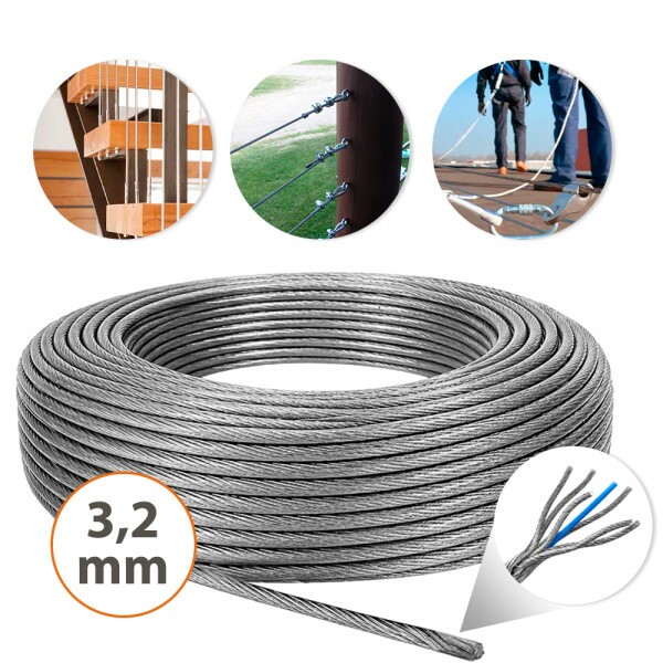 Sua construção 6x7 vias com alma de fibra oferece boa acomodação para instalações leves e curvaturas moderadas. O aço galvanizado ajuda na resistência à oxidação, enquanto a ausência de revestimento facilita o uso com grampos, clips, esticadores e acessórios de fixação.