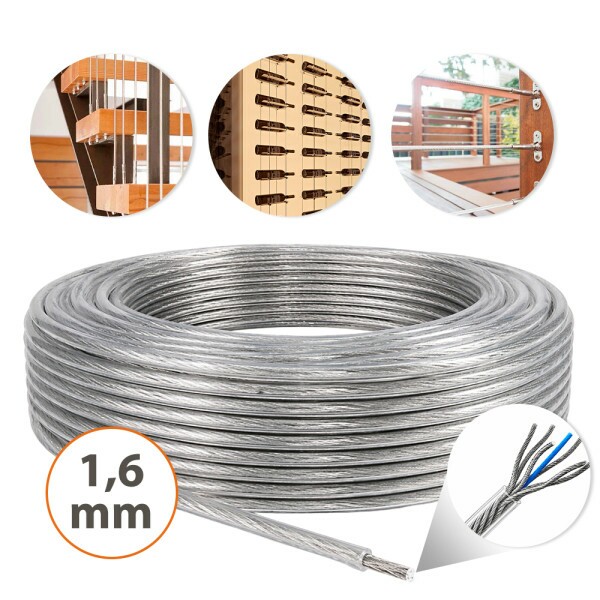 O Cabo de Aço Revestido em PVC Cristal 1,6mm 1/16" 6x7 AF - G-Force CIKALA é indicado para aplicações leves de fixação, sustentação, estaiamento, varal, guarda-corpo e pequenos mecanismos.